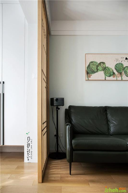 日式原木的溫暖與綠色元素在空間里流動(dòng)和穿透,透過(guò)室內(nèi)鏤空木質(zhì)屏風(fēng)和墨綠色沙發(fā)
