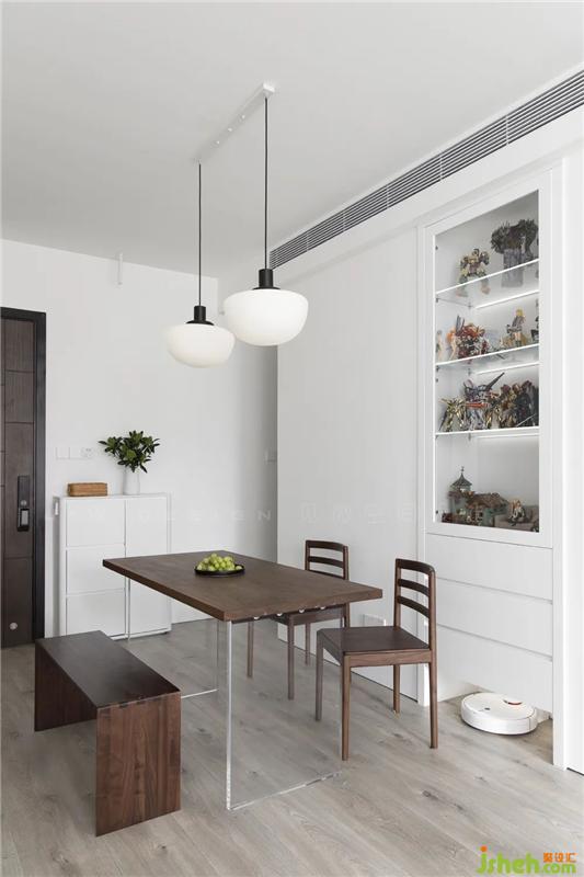 入門即是餐廳,此處打造成一個進門別致的格局,配置質感十足的餐桌,透明的亞克力桌腿呈現獨特的懸浮設計感,玻璃櫥窗的手辦展示柜搭配燈光更將視覺直接吸引,成為空間亮點深圳室內設計。