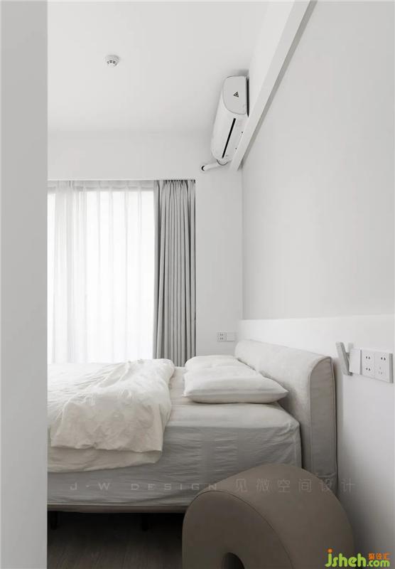除卻復(fù)雜的裝飾,減少色彩的搭配,設(shè)計(jì)師在細(xì)節(jié)上需要思考的更多,床品采用輕灰棉麻質(zhì)地可以消除極簡(jiǎn)設(shè)計(jì)的單調(diào)感,賦予空間素凈的暖意。