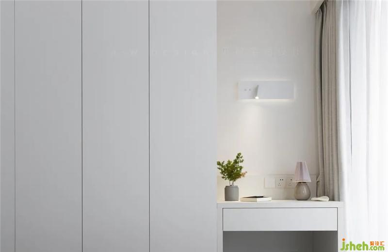 次臥主要考慮空間合理利用的問(wèn)題,在保證舒適度的同時(shí),提升實(shí)用性。衣柜做了兩截門(mén)板的特殊處理,不僅解決了空間問(wèn)題方便日常使用,還提高了收納布局,在簡(jiǎn)潔的空間里增添層次。