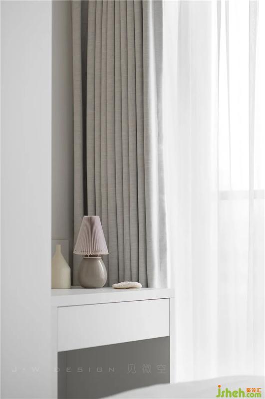 主臥延續(xù)了白色的主色調(diào),窗簾及床品做了一個(gè)灰色層次處理,營(yíng)造出了安靜、精致的空間基調(diào),與溫潤(rùn)的木質(zhì)地板呼應(yīng),達(dá)到舒適的平衡深圳室內(nèi)設(shè)計(jì)。