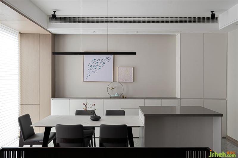 原客廳外陽(yáng)臺(tái)納入客廳餐廳擴(kuò)大客餐廳空間,讓餐廳和島臺(tái)連接形成“洄游”空間,來(lái)增加活動(dòng)空間。餐廳家具融入了“古風(fēng)”的元素,溫文爾雅的中式風(fēng)在溫馨的空間氛圍里,展現(xiàn)著藝術(shù)的多元化。
