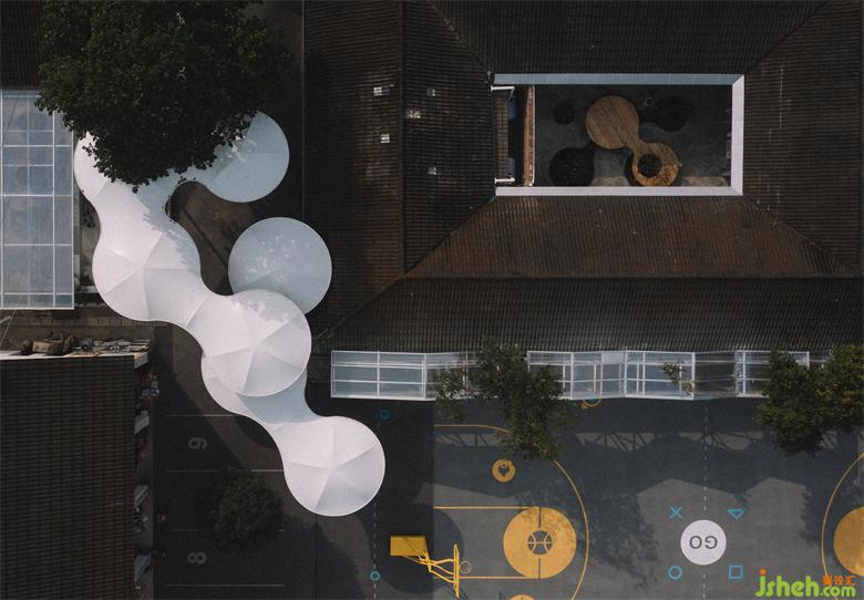 通過檐廊和雨棚來拓展生活空間,同時選擇易于建造的鋼構(gòu)+陽光板、鋼構(gòu)+膜的建造方式增加空間尺度與情感層次。檐廊的造型介于小屋和半亭之間,最簡單的坡屋面完成每個孩子心中提供庇護的家的隱喻。排列成一串序列的檐廊完全改變了原來建筑立面水平檐口+標準窗洞的冷漠,互相獨立,卻又同時形成一個如同群山起伏的整體,象征著孩子們手拉手的村落。云朵形態(tài)的雨棚,如同媽媽的懷抱消融原本各不相干的建筑體量,又好似孩子們的嬉鬧追逐,串聯(lián)起整個場地的建筑與自然。尊重一草一木,給予平等的關(guān)懷,在情感安頓之后仿佛又回想起第一次驅(qū)車進入北川的那一天,眼前那延綿起伏的山與山間漂浮的云。