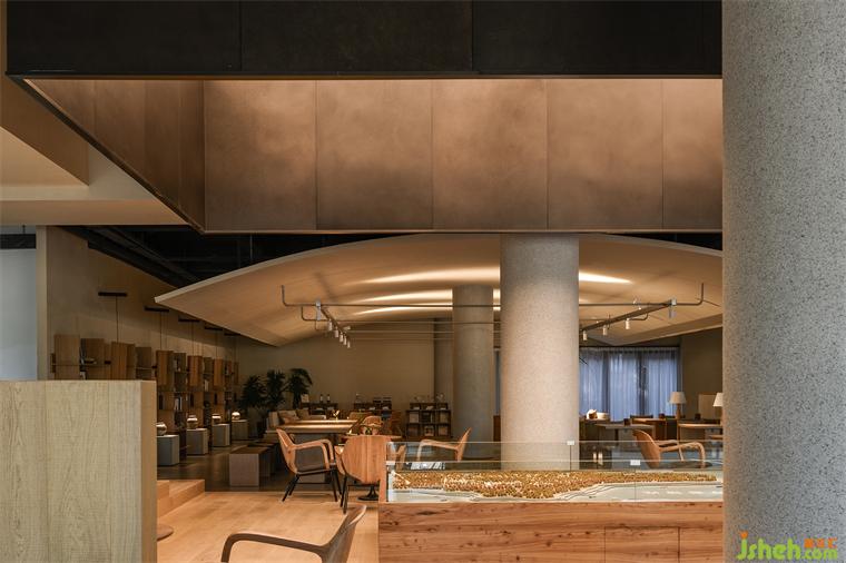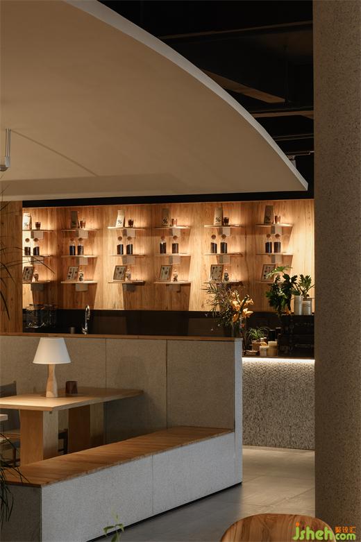 進(jìn)入空間內(nèi),用于日常接待的吧臺與營業(yè)用的吧臺被合理的動線分開,互不打擾,但在視覺上構(gòu)成了一個(gè)整體。我們希望在不更改它的結(jié)構(gòu)形式的前提下,能夠最大化的讓整個(gè)空間融為一體,模糊有形的邊界,加強(qiáng)不同區(qū)域之間的聯(lián)結(jié)與互動。僅以不同形式天花和地面的高差及材質(zhì)的變化勾勒出屬于不同功能分區(qū)之間的秩序線索,也為同一個(gè)空間創(chuàng)造出更為豐富多樣的體驗(yàn)。