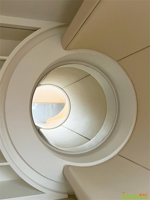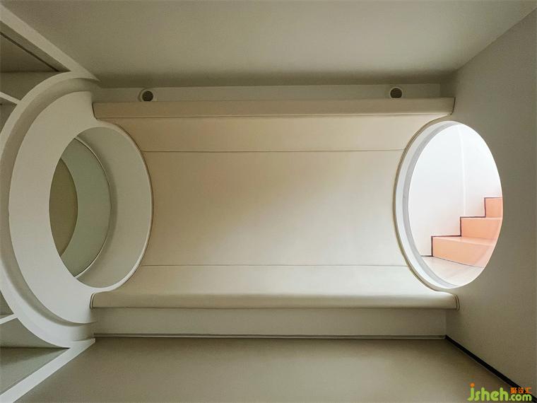 別墅設(shè)計(jì)師利用兩層通高的客廳,頂部設(shè)置的一處太空艙更是對(duì)關(guān)系具像化呈現(xiàn)的“神來(lái)之筆”——人在其中安心地獨(dú)處、閱讀,也可以從高處俯瞰整個(gè)客廳的活動(dòng),在空間通過(guò)目光的交匯,互通有無(wú)。和家人共處時(shí),也可以完全的做自己,這大概是有關(guān)家庭生活最美好的場(chǎng)景。