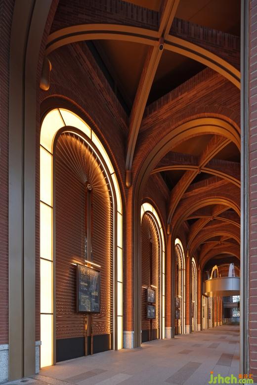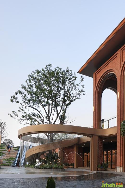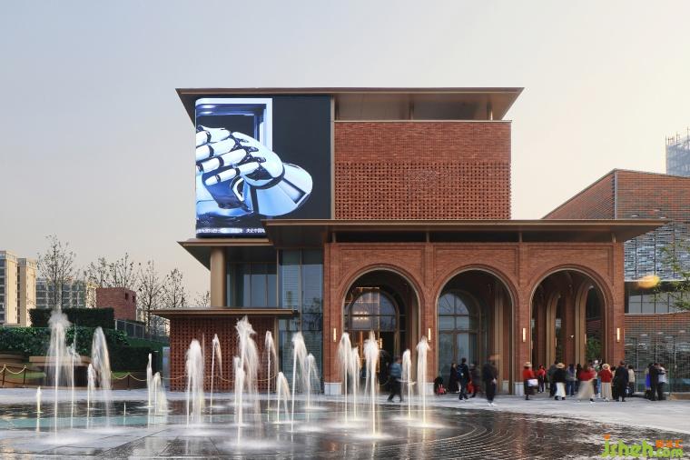 街區(qū)中的核心建筑將奠定整個(gè)商業(yè)呈現(xiàn)出的氣質(zhì)。因此,售樓部的改造不僅注重美學(xué)上的提升,更強(qiáng)調(diào)將文化屬性注入。西側(cè)的設(shè)計(jì)采用了“寓舊于新”的理念,挖掘城市的歷史印記,以“悅來(lái)文化”為引,進(jìn)行了一場(chǎng)關(guān)于傳承與發(fā)展的古今對(duì)話。