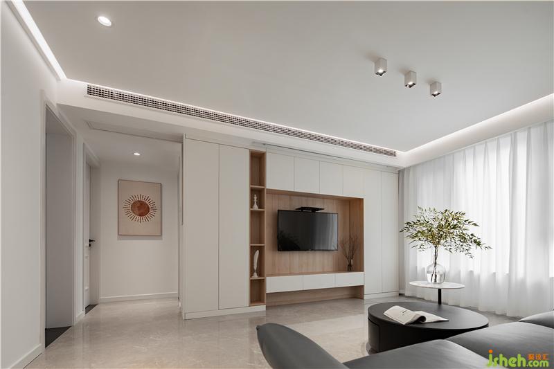 客廳的電視墻做了一整排裝飾柜,增加了客廳的儲(chǔ)物空間南京室內(nèi)設(shè)計(jì)師,在裝飾柜的墻面還有一個(gè)隱藏式的幕布,不光增加了儲(chǔ)藏空間,而且還兼有娛樂的設(shè)施。