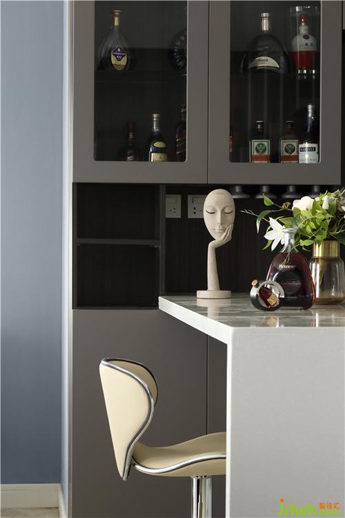 吧臺(tái)處大理石臺(tái)面與深灰色裝飾柜的巧妙結(jié)合,在彰顯空間精致感之余,也起到了視覺延伸的作用;原有的廚房,又增加了一個(gè)“島臺(tái)”,讓餐廚區(qū)形成了一個(gè)可供家人情感互通的整體......