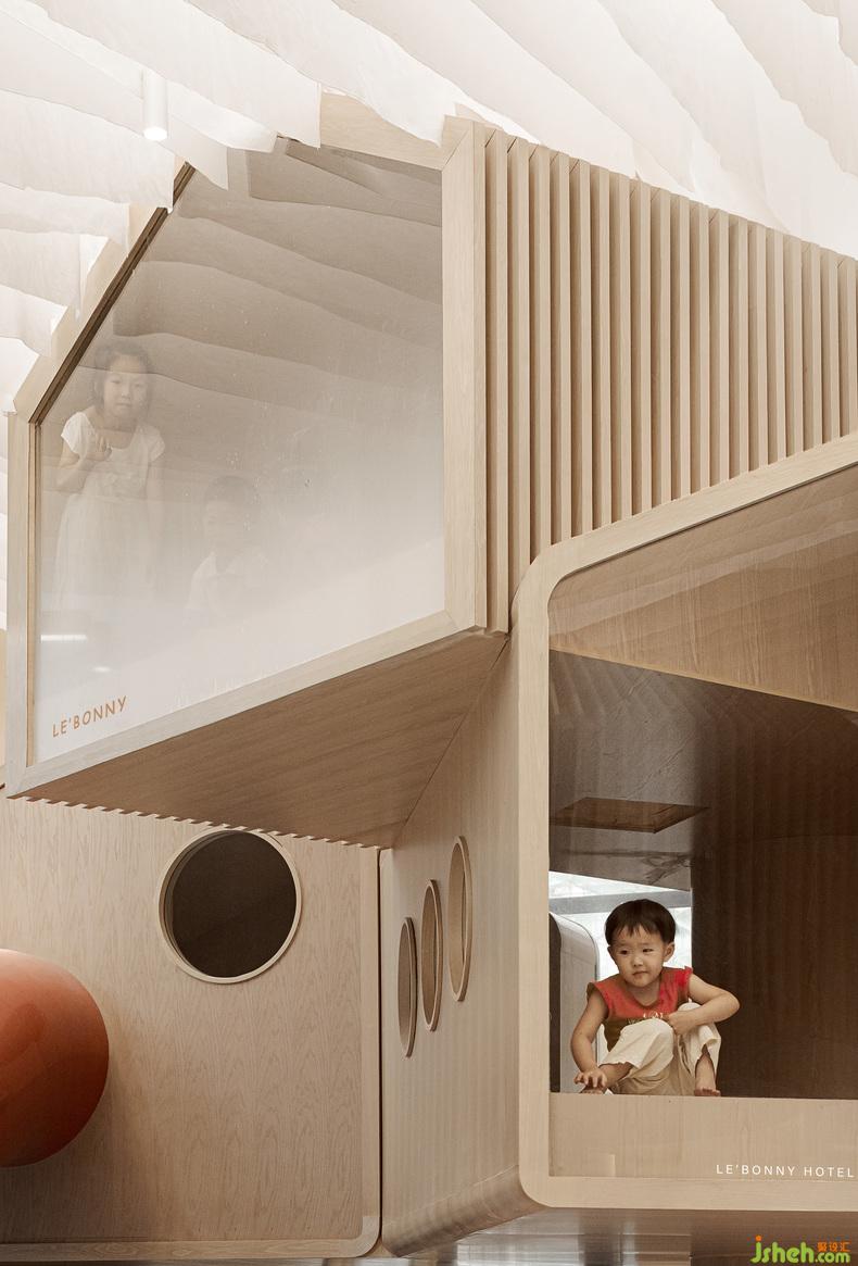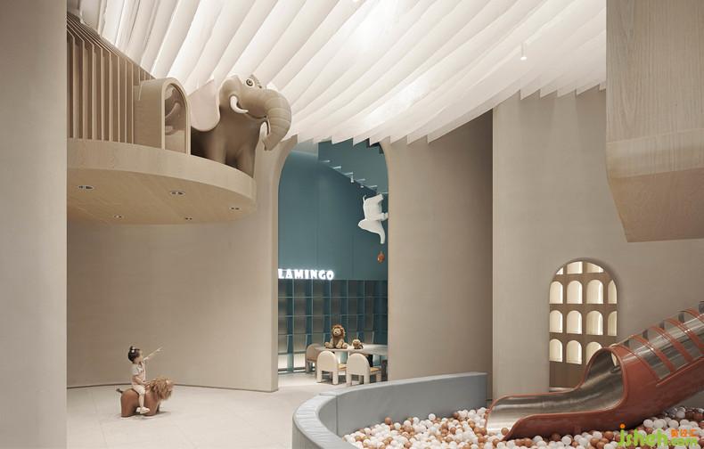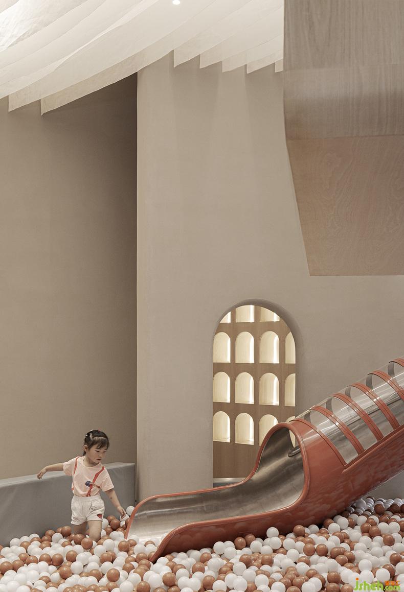 空間中考慮到各種不同形式兒童行為活動,希望在樂貝大堂空間內(nèi)容納更多的功能可能性,豐富活動樂園的使用性。當(dāng)小朋友在泡泡池玩耍,攀爬區(qū)攀爬的時候,大人可以一起陪同冒險,也可以在休息區(qū)與木屋內(nèi)的孩子揮手打招呼,室內(nèi)設(shè)計師小朋友能感受到冒險的樂趣,同時也能感受到來自家人的陪伴,來自家人的愛意。