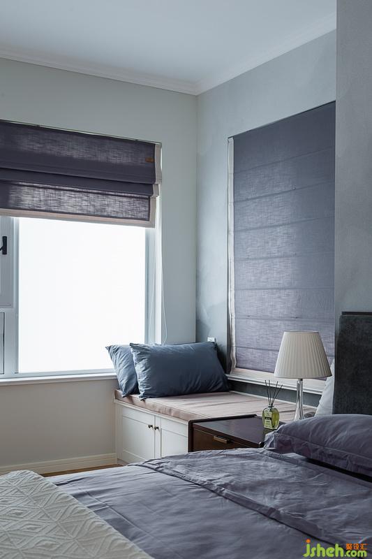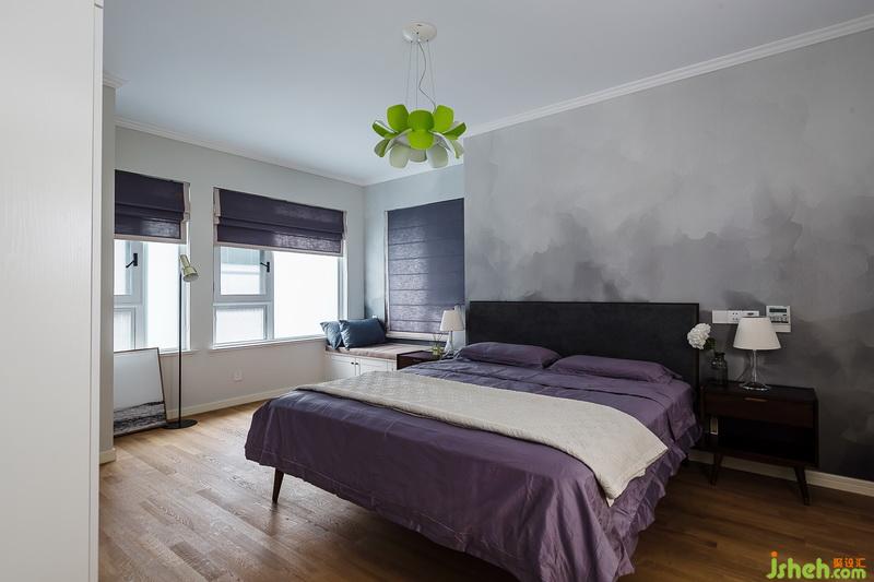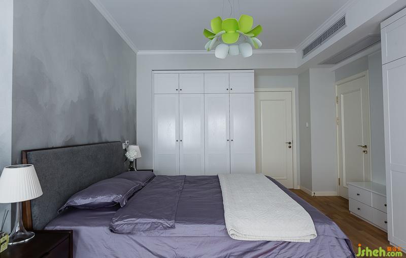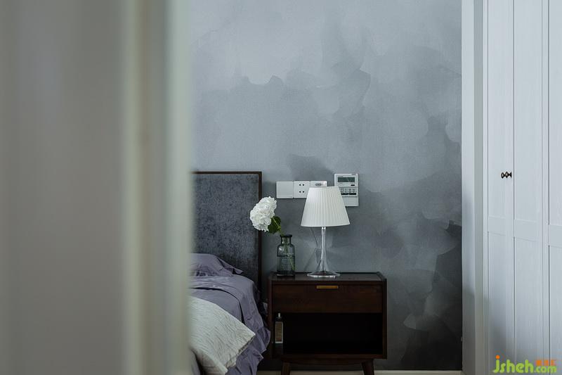 主臥室儲(chǔ)物需求較大,占用一部分書(shū)房空間做了兩組衣柜來(lái)滿足。色調(diào)上跟其他空間不同,室內(nèi)設(shè)計(jì)師采用灰色調(diào)煙霧墻紙搭配深灰色實(shí)木床軟包安靜內(nèi)斂。原木色地板與灰色相稱(chēng)自然簡(jiǎn)潔。