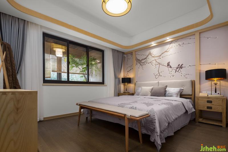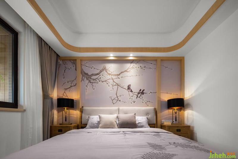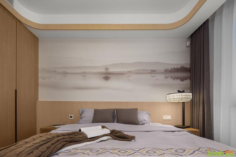 室內(nèi)設(shè)計者在次臥室用了無靠背的床架,跟墻面的半截裝飾板搭配的天衣無縫。上面半截壁畫畫面靜謐悠遠,很契合臥室的使用功能。