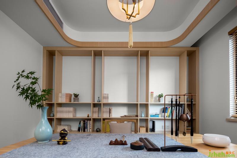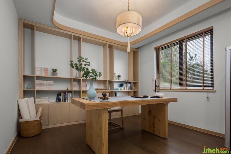 書房全貌。書架下面一排封閉式儲物可以放置雜物、文件等,滿足不同儲物需求。由于老爺子喜歡炒股和寫毛筆字,所以書桌對面是個顯示屏,可以隨時關(guān)注股市走向。原木大板桌造型質(zhì)樸簡潔,練毛筆字再好不過了。地上的越南藤編簍子既是裝飾也是畫卷等收納處。