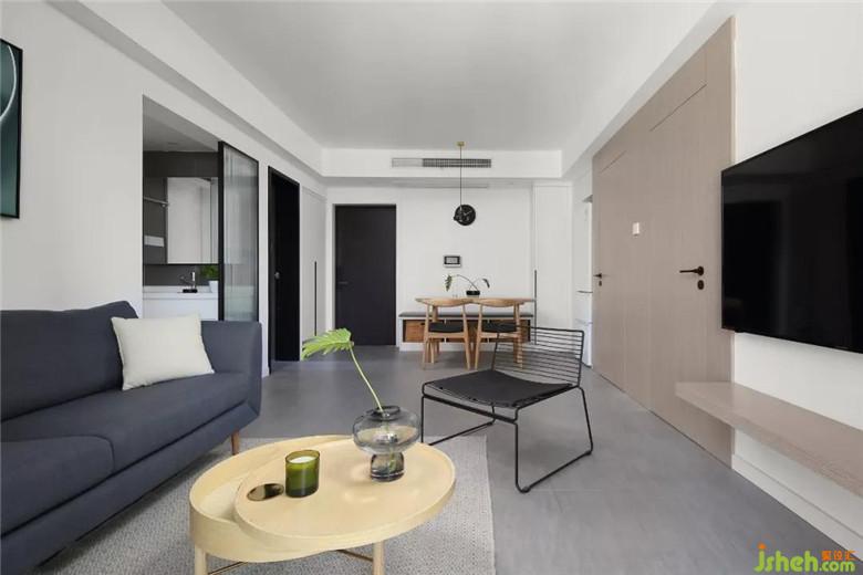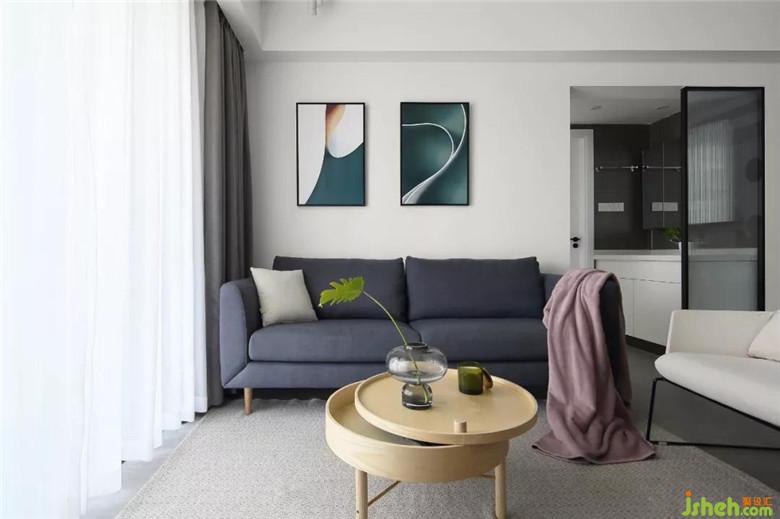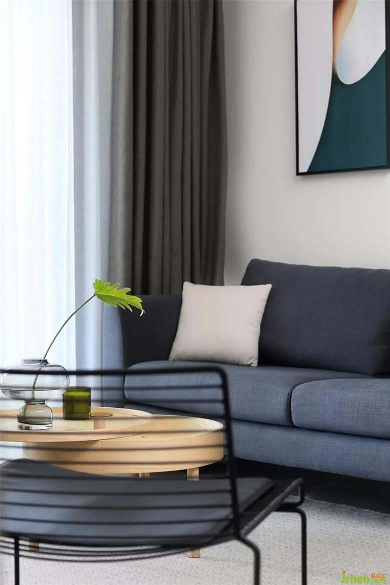 藍灰色的沙發(fā)搭配黑色線條沙發(fā)椅,米色羊毛地毯,冷靜克制中又有著柔軟的親切感。