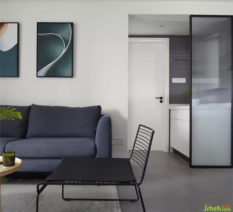3. 衛(wèi)生間干區(qū)墻體拆掉后用玻璃隔斷做遮擋更加通透;廚房做了完全透明玻璃門,增加與外界空間的