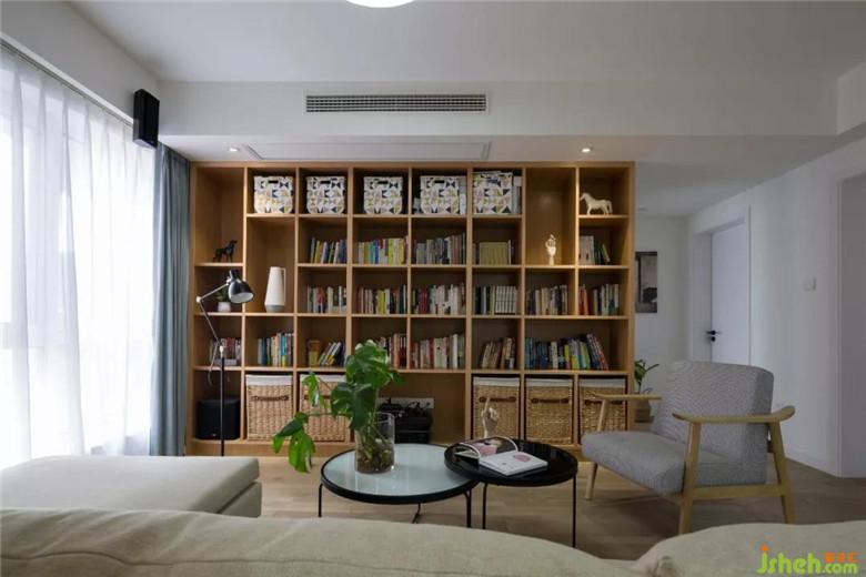 一整面墻的敞開式書柜,同時也把影音設(shè)備收納其中,也滿足了男業(yè)主一直以來的滿墻書柜的愿望,生活在夢想中的房子里,愛人在側(cè),這就是美滿的生活吧!