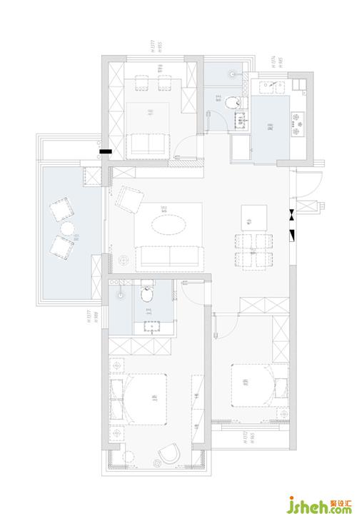 ▲原始平面圖 優(yōu)點是沒有任何浪費的空間(這點其實也是缺點,因為沒有浪費空間也表明同時沒有任何回旋余地過渡空間。),同時陽臺足夠?qū)挸?。缺點就是沒有門廳,廚房空間相對較小。