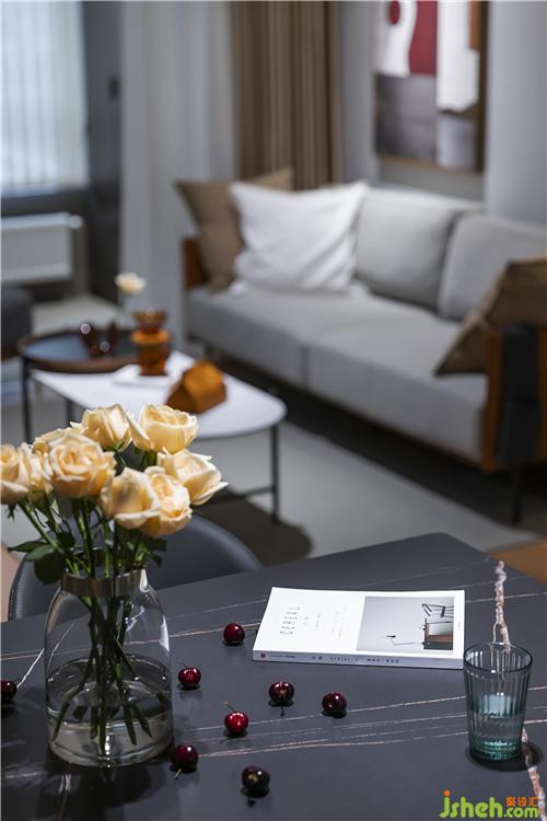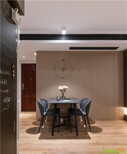 ▲勞倫黑金巖板餐桌,配以灰色真皮餐椅,穩(wěn)重精致。整面的KD板,再內(nèi)嵌隱形門,保持客廳的整體性和完整度。KD板細膩的紋理,天然成為西班牙鐘的鐘面,不著數(shù)字的表盤,讓人領(lǐng)會時間中的留白南京室內(nèi)設(shè)計師。