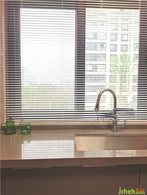 ▲廚房 高柜中內(nèi)嵌蒸箱、烤箱。洗碗機(jī)、拉籃各執(zhí)一邊,合理分區(qū)。下沉式臺盆配以抽拉式水龍頭和凈水龍頭。側(cè)吸的油煙機(jī)凸顯U型廚房的精致。金屬百葉簾調(diào)節(jié)光線南京室內(nèi)設(shè)計師。以女主人身高量身定做的高低臺,操作便捷,烹飪美食,亦是調(diào)味生活。