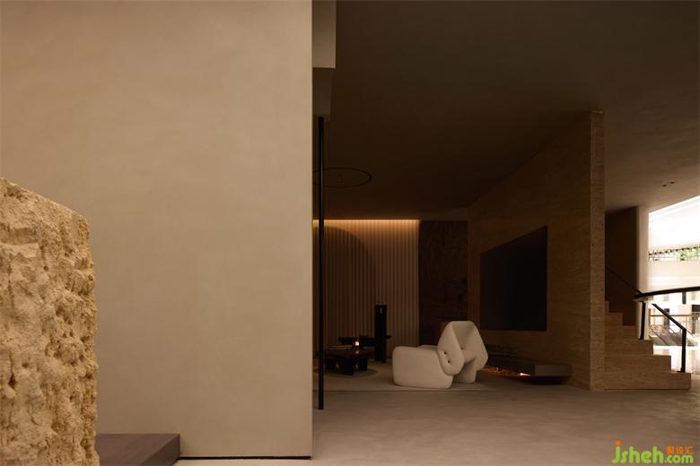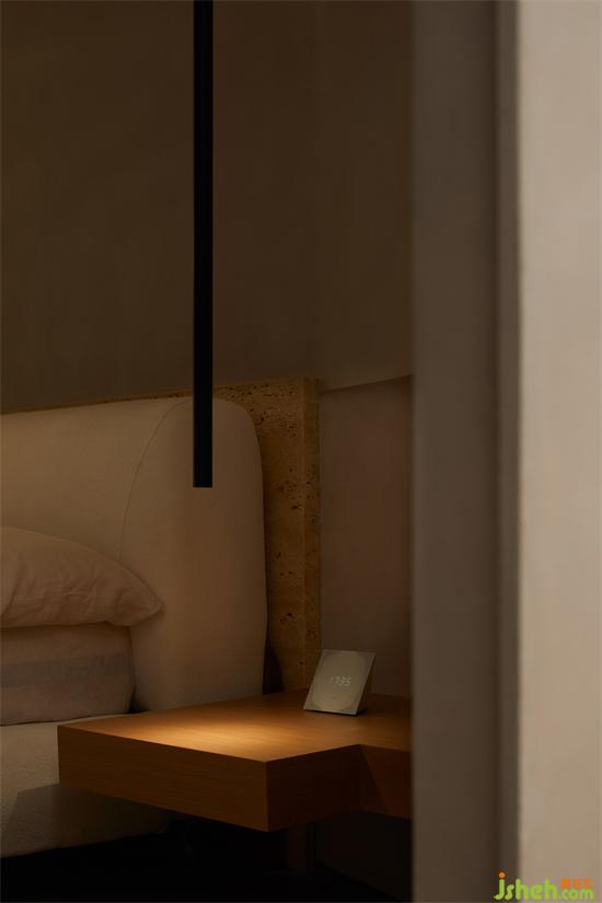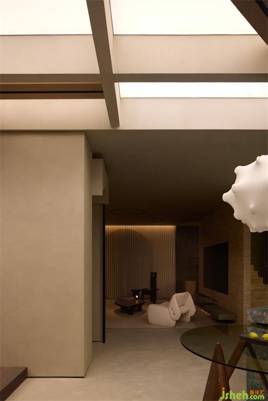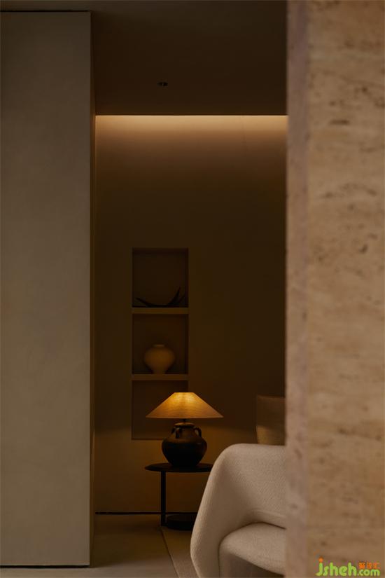 所以在整體的平面布局里,展廳設計依據(jù)功能劃分為三個層級,從入口到餐廳、起居和臥室,再到品茶區(qū)、“光通道”以及燈光魔盒展區(qū),依次漸進,訪客從外入里,拾級而上,情緒、節(jié)奏、能量同樣產(chǎn)生著微妙的變化。這種以“光”為媒介,復合的,多感官的、悄然發(fā)生的音樂性過程,我們稱之為“光”的三重奏。