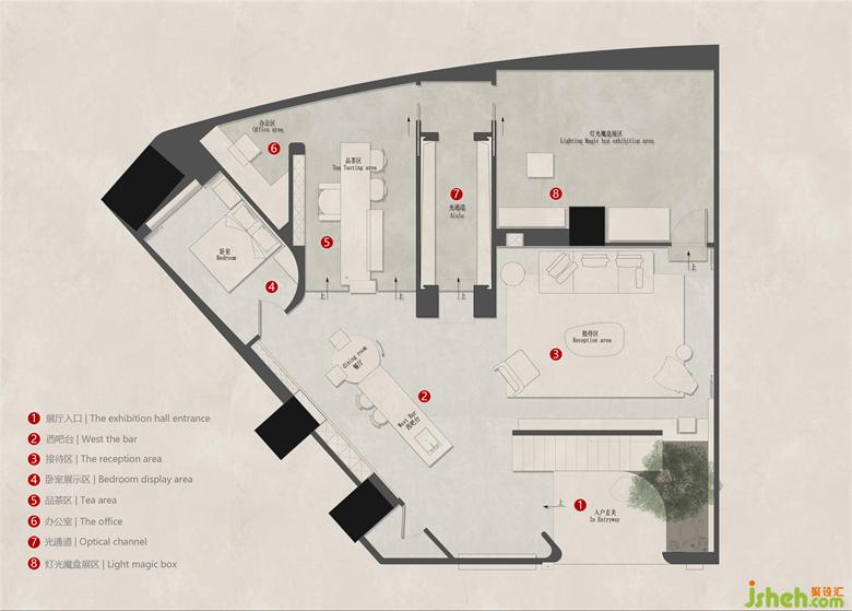 Therefore, in the overall layout, the exhibition hall is divided into three levels according to its function, from the entrance to the dining room, living room and bedroom, and then to the tea tasting area, "light channel" and the lighting magic box exhibition area. The visitors step up from the outside to the inside, and the mood, rhythm and energy also produce subtle changes. This kind of compound, multi-sensory and stealthily occurring musical process with the medium of "light" is called the trio of "light".