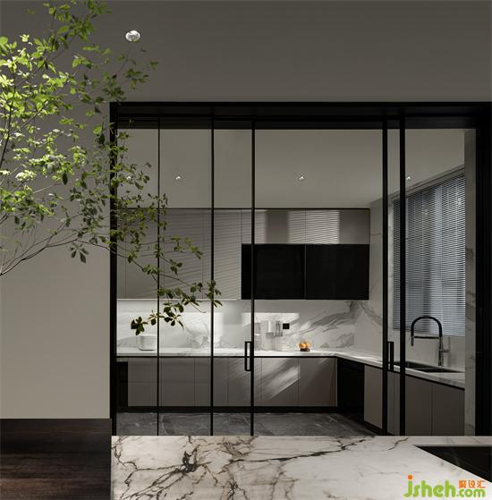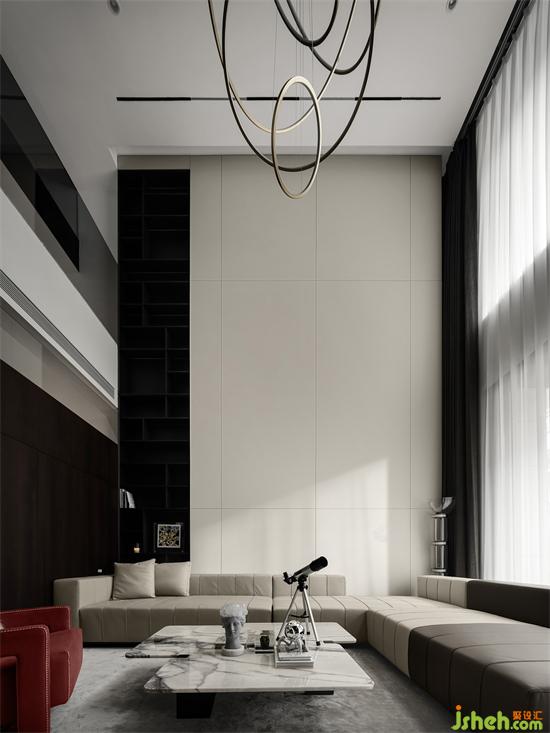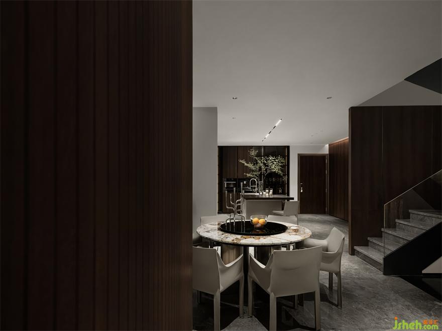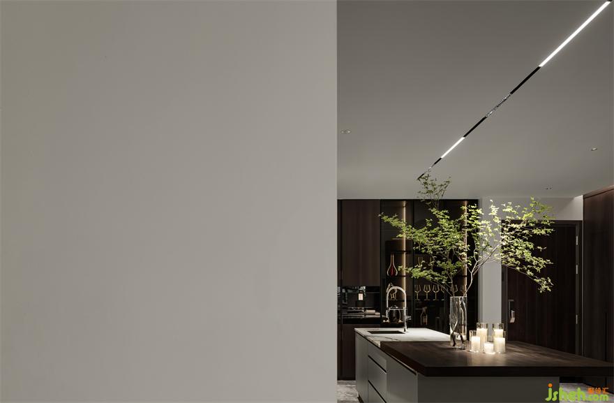 住宅的一層被規(guī)劃為公共生活區(qū),包括客廳,餐廳以及廚房客廳的中心區(qū)域,別墅裝飾設(shè)計(jì)整個(gè)空間是開放而流動(dòng)的,黑色的壁爐鑲嵌在煙熏橡木色制作的通高的展柜之間,溫暖而有質(zhì)感,當(dāng)外面的落地玻璃打開,空間和花園連接起來,整個(gè)空間會(huì)變成一個(gè)社交型場所,在這里可以品酒,聚會(huì),戶外燒烤,一場流動(dòng)的盛宴會(huì)在這里發(fā)生。對家的定義每個(gè)時(shí)代的人對它的認(rèn)知是不同的,三年疫情或許讓很多人的生活方式發(fā)生了改變,聚會(huì)和社交已經(jīng)逐步的變成了私宅的一部分。