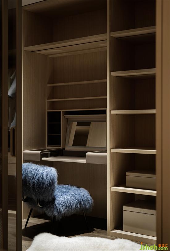 豪華的步入式衣帽間被巧妙地隱藏在一個(gè)深色木飾面的體量中,別墅裝飾設(shè)計(jì)衣帽間的兩側(cè)設(shè)有滑動(dòng)門。當(dāng)滑動(dòng)門關(guān)閉時(shí),衣帽間便是一個(gè)封閉的私密的半通透的空間。