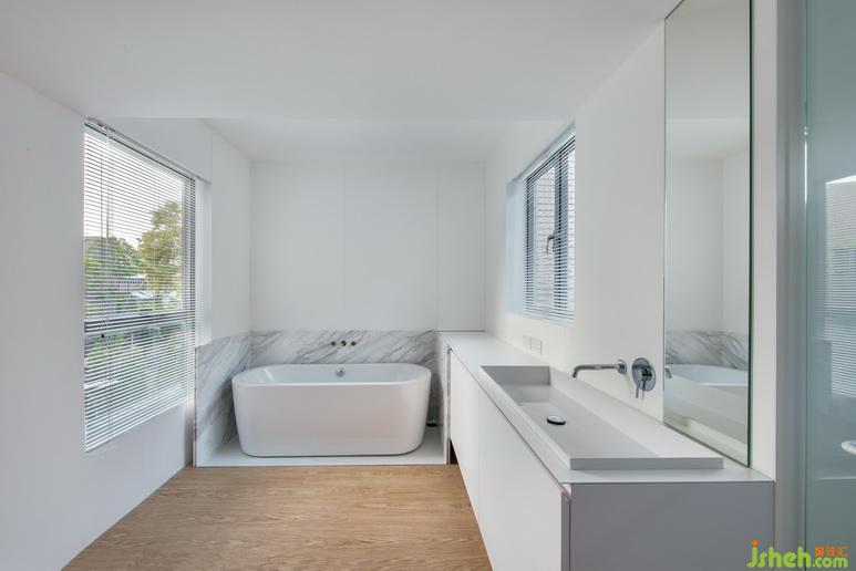 大理石磚面與瓷白衛(wèi)浴堪稱絕配,百葉窗、水龍頭、鏡面則將極簡(jiǎn)風(fēng)推向了新高度