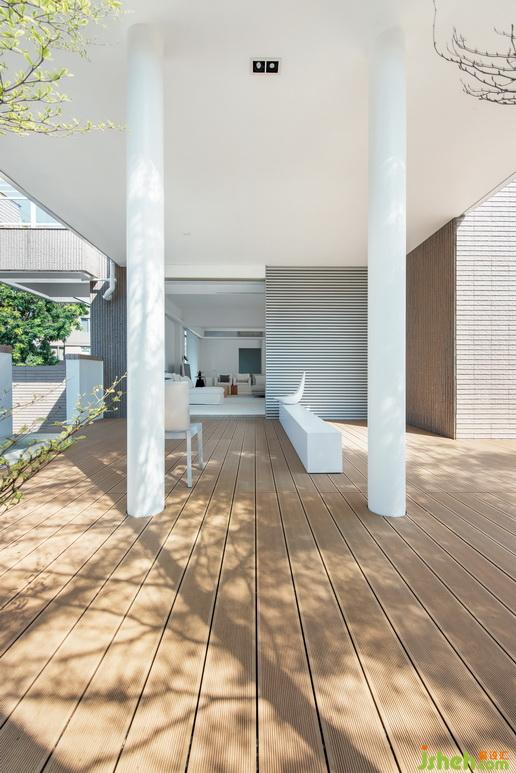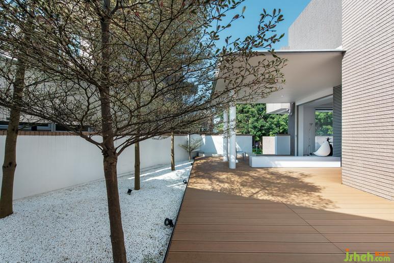 室內(nèi)整體風(fēng)格凸顯現(xiàn)代感,而室外更加親近大自然。淺色木地板與細(xì)紋外墻交相呼應(yīng),桌椅、裝飾則都是飽和度較低的淺色,以及遼闊的無邊游泳池,不僅勾連了室內(nèi)、室外,更與大面積普照的陽(yáng)光融為一體。大型綠植則是后院的亮點(diǎn),姿態(tài)蓬勃的褐色枝干是后院最好的裝飾,與線條平直的淺色桌椅相映成趣;枝頭綻放的點(diǎn)點(diǎn)綠意,則為房子增添了不同于完美樣板間的精彩與生氣。