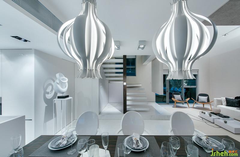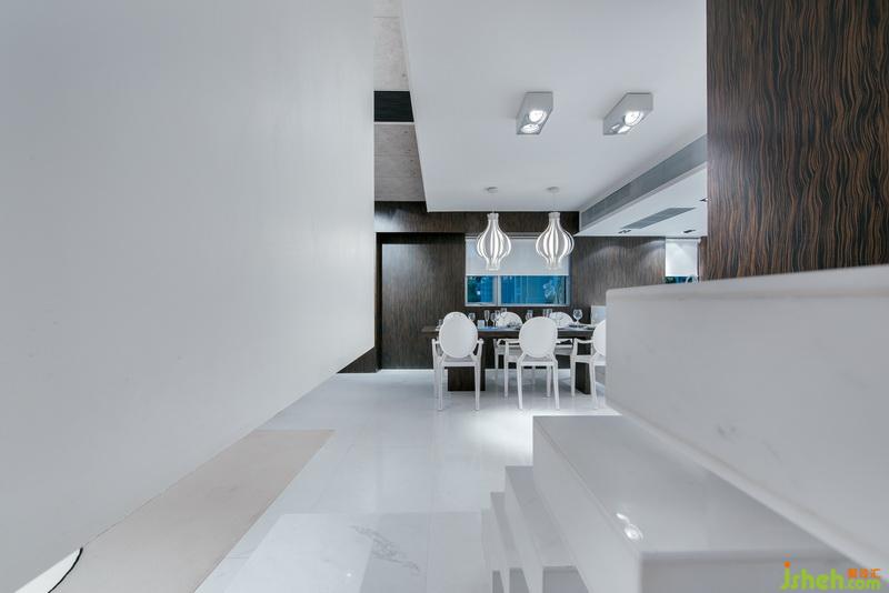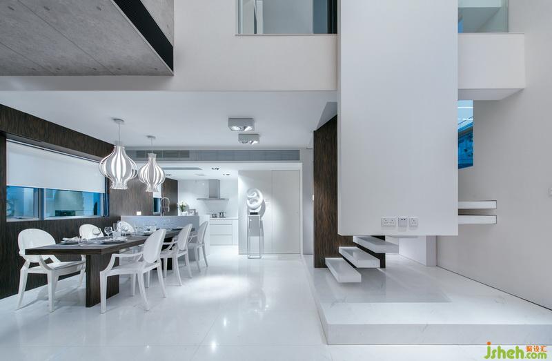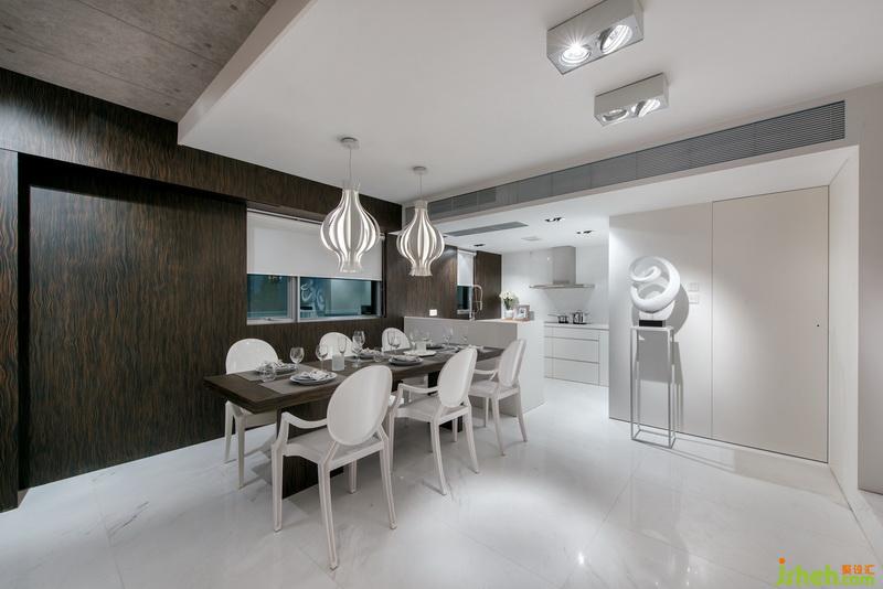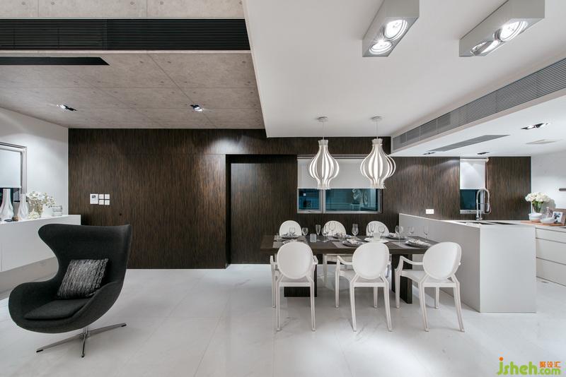 白色可麗耐臺面與潔白的大理石交相呼應,深棕木制墻壁一掃極簡空間的清冷