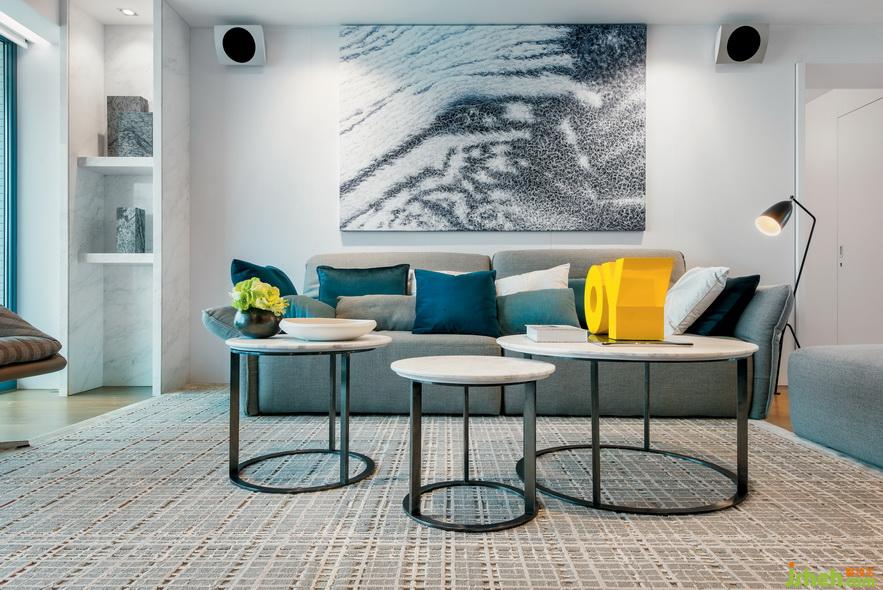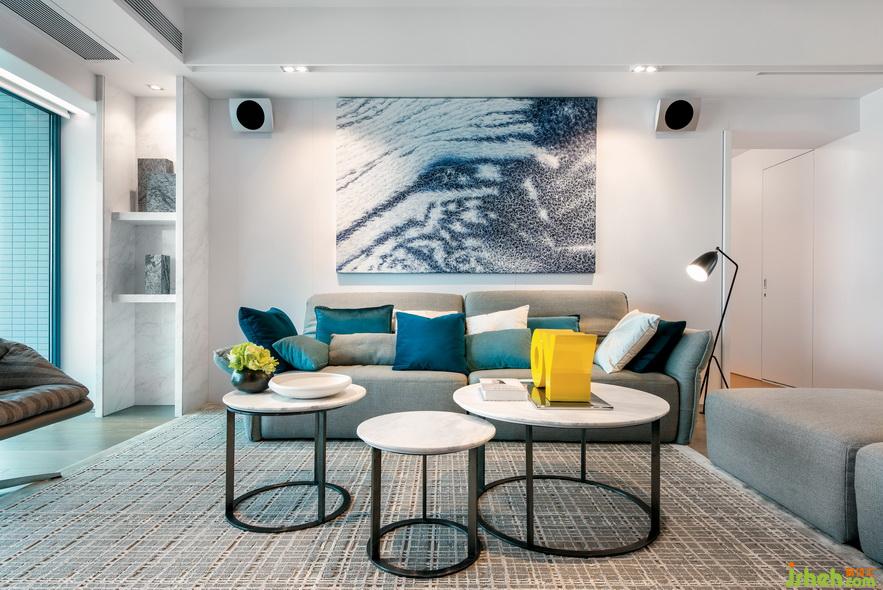 客廳大面積使用灰藍(lán)搭配,掛上靈動百變的藍(lán)色背景畫,與比鄰的大海相呼應(yīng)。灰色元素?zé)o處不在,沙發(fā)的高級灰、地毯的云灰色、仿佛給空間蒙上一層淡淡的面紗,奠定了沉穩(wěn)簡約的風(fēng)格。而深淺不一的藍(lán)色抱枕,盡顯空間層次,給人以變化美感。