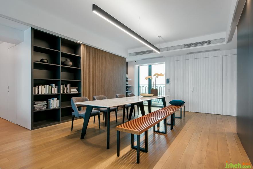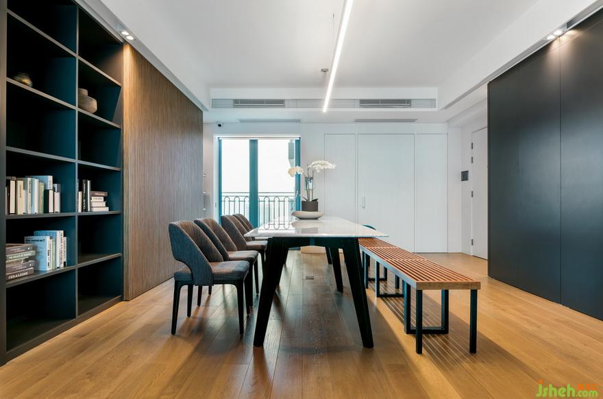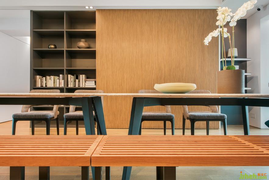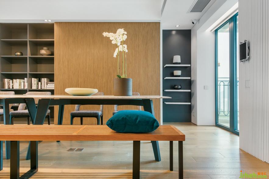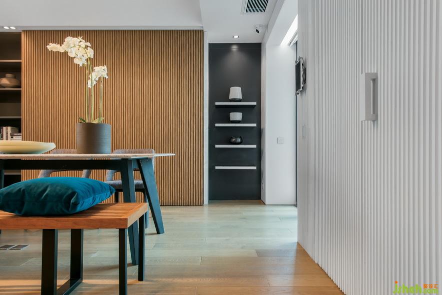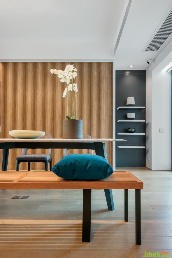 客廳與餐廳間沒有明顯隔斷,室內(nèi)設(shè)計師巧妙地以顏色來劃分。這種留白設(shè)計,做到了“無形似有形”,也保證了空間的通透與視線的暢通。餐廳的設(shè)計極具趣味,灰白布椅正對深灰色墻面是一種現(xiàn)代簡約風(fēng)。實木長椅正對豎木條隔板是一種自然閑適風(fēng)。一個空間兩種風(fēng)格,混搭但不混亂,對立但不沖突。