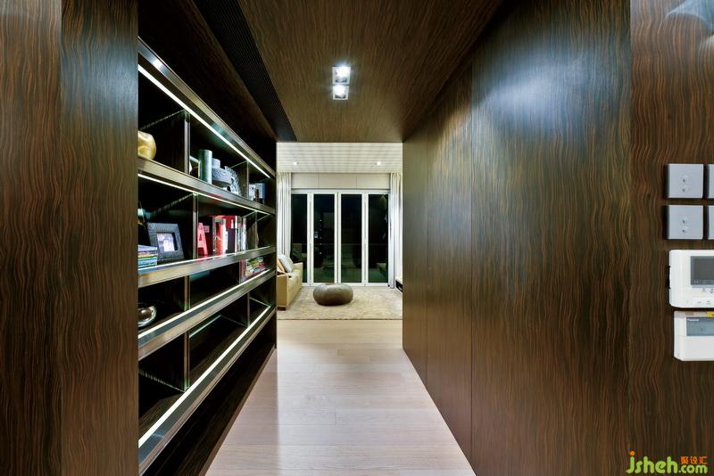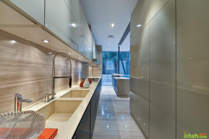 廚房采用一體式設(shè)計(jì),金屬色立柜與餐廳一脈相承,吊頂射燈與香檳色瓷磚不僅未來感十足,更無清潔困難之虞。