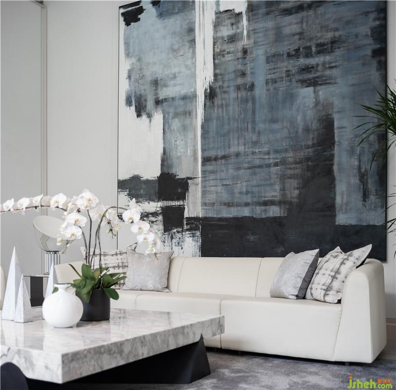 走進(jìn)銷售中心西南角的貴賓室,這一空間在色彩上選用了以白色為主的簡約柔軟色調(diào),在場景的布置上選擇了“中心合圍式”布局。在細(xì)節(jié)設(shè)計上,變化在于高大的藍(lán)色墨染涂鴉背景墻,在光影照射下好似一副流動的水墨畫;見棱見角的大理石茶幾是整個空間的中心,石材的硬冷反倒襯托出白色皮質(zhì)沙發(fā)的細(xì)膩和灰色絲絨地毯的質(zhì)地,低矮的家具選取和不貼四邊的擺放使得整個空間在視覺上被縱向提高了一個層次,在橫向布局上也更顯寬敞明快。這些設(shè)計上的奇思妙想都為日常的迎賓會客增添了居家圍坐的輕松和閑適,卻又不失格調(diào)與排面。