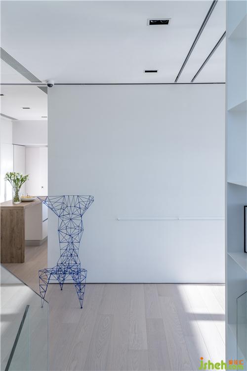 從入門處玄關(guān)的一白及頂?shù)戒仢M全屋地面的燕麥長磚,從客餐廳組合沙發(fā)的灰藍基色到廚房中島的木質(zhì)條紋,采用低飽和度的莫蘭迪色系,使整屋給人以觀感上的清爽耐看和恰到好處。同時,點綴黑色用以誘發(fā)視覺聚焦,如在客餐廳與書房空間縱橫布局的軌道燈帶、鐵藝鏤背座椅和高低錯落的意式組合茶幾,宛若在美人如凝脂白玉的肌膚上略施粉黛,用色彩沖突的線條、色塊讓原本素雅的空間頓時有了“妝容”,生出靈性。