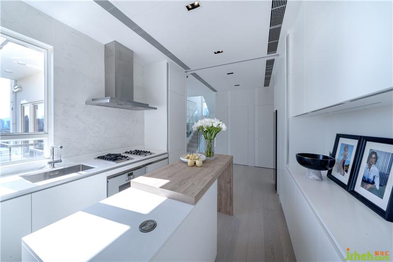 先看動區(qū),入門處,白色玄關(guān)左側(cè)是廚房和傭人房,右側(cè)是客廳。廚房采用了半開放式設(shè)計,西廚中島就像變形金剛一樣好用,滿足了屋主對于料理、收納、輕餐、社交,甚至拆快遞箱,所有對于廚房的功能想象。在廚房內(nèi)部就是傭人房,并配套有衛(wèi)生間、洗衣房。在這里需要提出表揚的是,設(shè)計師考慮到全屋的動線流暢和功能銜接,為廚房設(shè)計了雙動線(入門玄關(guān)一條線,客廳一條線),避免了傭人買菜、曬衣經(jīng)過客廳的尷尬,做到了兩個空間的既相互連同又互不干擾。