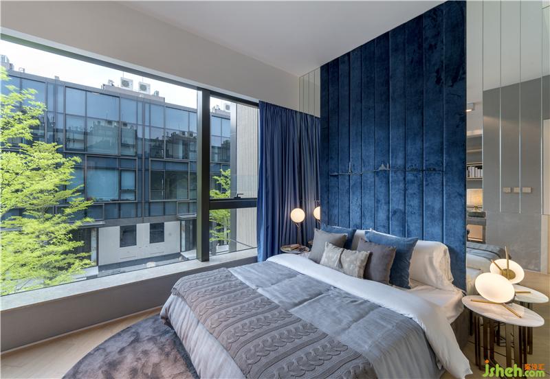 同層右側(cè)區(qū)域的次臥,以摩登現(xiàn)代的港式風(fēng)格作為裝潢基調(diào),選材以布木為主,輔以金屬。布局于背墻中央的藍(lán)色布藝沉穩(wěn)內(nèi)斂、不動(dòng)聲色,一鏡到頂、分置床頭的金屬鏡墻色厲內(nèi)荏、倒影暖光,布藝的質(zhì)樸與金屬的藝術(shù)碰撞出現(xiàn)代,藍(lán)的冷凝與光的氤氳相遇出復(fù)古,共處一室成為現(xiàn)代的復(fù)古。