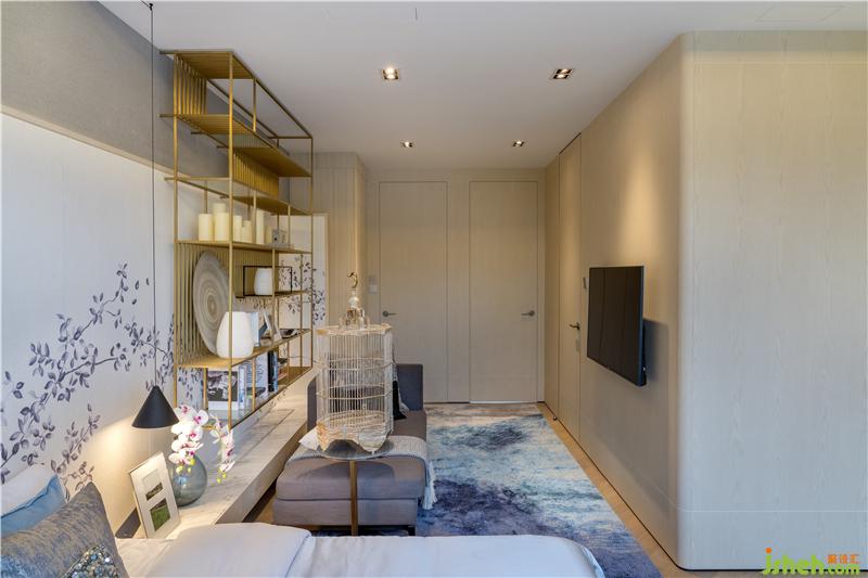 拾級(jí)漫步來到三樓,有限的45㎡空間之內(nèi),設(shè)計(jì)師采用大量的木作圍身為屋主的起居活動(dòng)劃定邊界、守好隱私,嵌套木圍中的隱藏門扇為臥眠、盥洗和起居空間保持相對(duì)獨(dú)立的功能分區(qū)。香港別墅裝飾進(jìn)入主臥,180°全景玻璃幕墻既讓整個(gè)房間的光線無比通透,也讓屋外景觀的自然生機(jī)盡收眼底。隔空懸掛于背墻之上的黃銅格架將器物的實(shí)用之美與工藝之美合二為一、藏秀并舉,與貴妃榻旁、頗具古韻的鳥籠產(chǎn)生了器型、紋理、色彩、溫度的交融浸染、相映成趣。房間內(nèi)藍(lán)色墨染的地毯與花木折枝的墻飾與其他起居空間的中式元素協(xié)調(diào)一致、古韻樸拙。