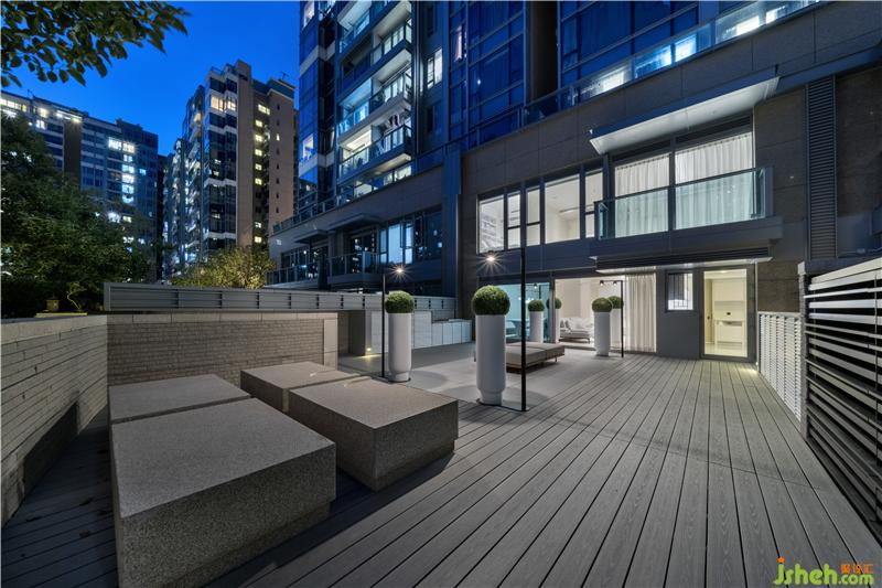 戶外光源設(shè)置同樣突顯設(shè)計(jì)巧思,六根Bodoni字體C形燈柱,為庭院的中軸景觀鑲上啞黑邊框,在一片素白底色中裁剪出立體感。