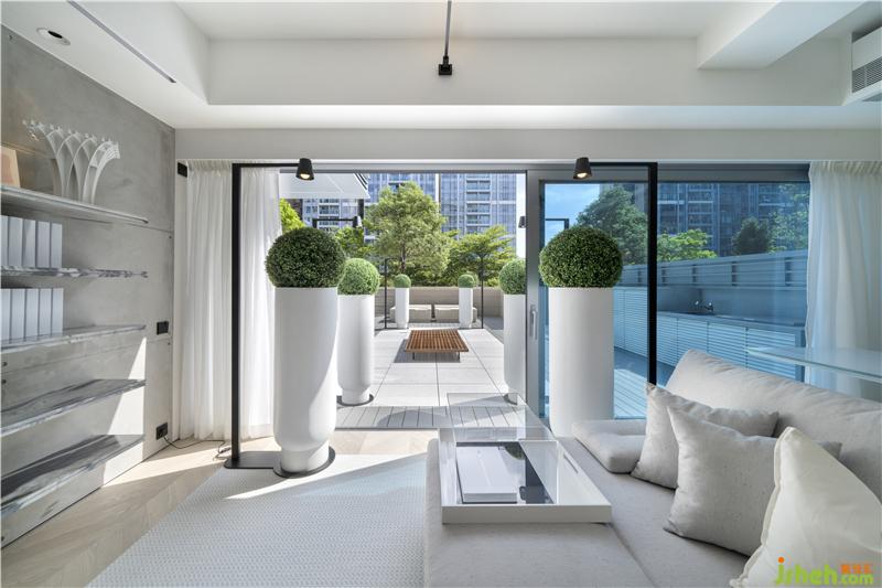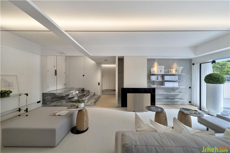 由庭院入戶是打開(kāi)這間用心之作的最佳選擇,你可以發(fā)現(xiàn)Danny團(tuán)隊(duì)“小心思”里的“大布局”。設(shè)計(jì)師沿庭院中軸線靈活地運(yùn)用了多組對(duì)稱排列:中部由外至內(nèi)對(duì)應(yīng)布局兩處休憩區(qū),一塊碩大的金色麻石一分為四,細(xì)節(jié)粗糲、香港別墅裝飾沉穩(wěn)而厚重,與之呼應(yīng)的是庭院中央一方較小的實(shí)木矮凳,質(zhì)感細(xì)膩、色厲而內(nèi)荏;分立兩側(cè)的三組巨型花筒,一字排開(kāi),延伸入室,素白的超高桶身與蔥郁的渾圓花球,柔和了此前矮凳尖銳的幾何突觸,并與粗點(diǎn)白麻石的地磚一起為戶外空間奠定了素雅大氣的色調(diào)氛圍;