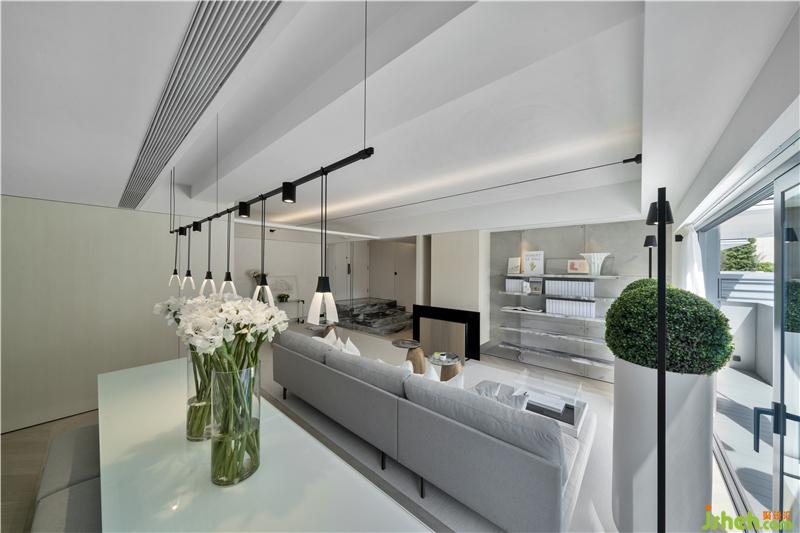 在房屋門楣挑高有限的情況下,設(shè)計(jì)師采取橫向拓寬采光面積搭配全落地玻璃的方案,把充沛的自然光源與新鮮空氣引入客廳,加強(qiáng)室內(nèi)外空間聯(lián)動(dòng);同時(shí)增加室內(nèi)挑高,減低壓迫感,香港別墅裝飾配合入門處不加雕琢的水泥展示墻與全屋現(xiàn)代簡(jiǎn)約的素色裝潢,整個(gè)空間熟稔親切、干凈自然。