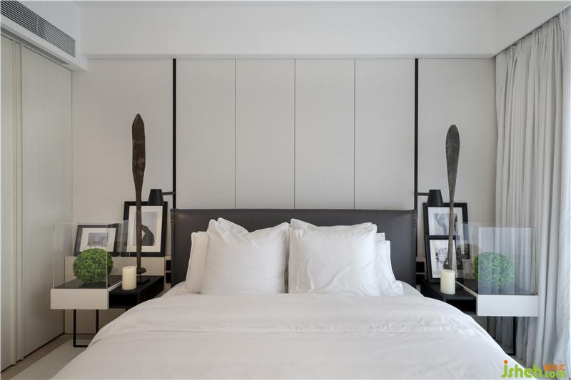 拾級而上,整個樓層都被規(guī)劃為靜區(qū),八百平尺、三室兩衛(wèi)和全臥室采光使得一家人的休憩獨處安逸從容、不受攪擾。通觀靜區(qū)的結(jié)構(gòu)布局與裝潢陳設,以主臥室為例,依然是素雅的白色打底,依然是無主燈的氛圍照明,黑色的線型條燈和C型落地燈,點綴以床頭蔥郁的渾圓花球,處處體現(xiàn)著與樓下動區(qū)的細節(jié)統(tǒng)一;而電視柜下不規(guī)則的原木支腳“喊話”床頭頗具異域風情的槳狀紅木擺件,與代表現(xiàn)代的印刷品和彰顯后現(xiàn)代的藝術畫混搭沖撞在一起,也揭示了屋主向往生活與藝術相互涵養(yǎng)、浸潤的詩意敘事和精神追求。