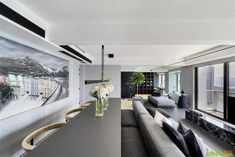 香港私宅設(shè)計整體動線以客餐廳為主體向四周擴散,利用體塊或材質(zhì)自然區(qū)分,過渡自然,最大地利用180度的窗戶敞開面形成縱向的視覺延展,實現(xiàn)人與人、室內(nèi)與室外的零距離的對話。