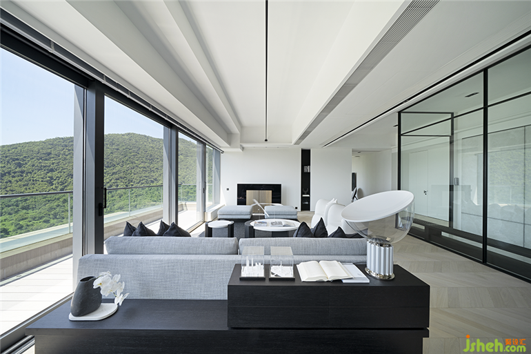 橫向超長(zhǎng)的客廳,因地制宜,全落地玻璃窗提供了直接的視野,香港私宅設(shè)計(jì)打破內(nèi)外界限,不經(jīng)意間將室外的自然光線與滿山黛綠引入室內(nèi),放眼之處,盡是壯麗的自然風(fēng)景。在潛移默化的全開放的空間氛圍中,外界的紛擾嘈雜,慢慢代謝消解,直至煙消云散。
