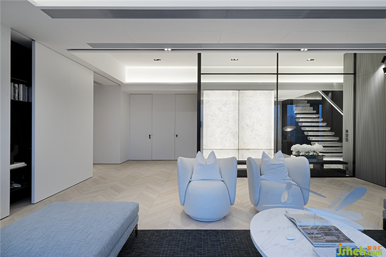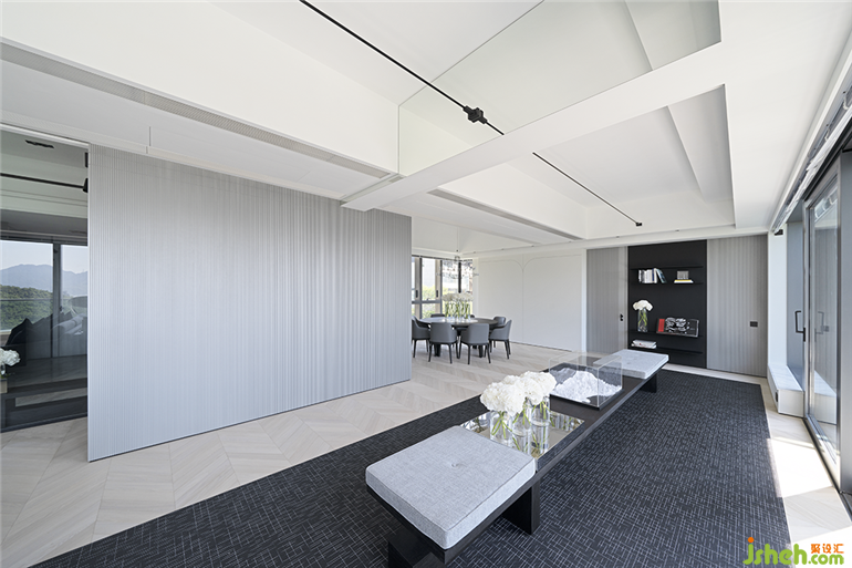 全開放的自由空間,開合有序,結(jié)合低調(diào)明快的現(xiàn)代元素的家居陳設(shè),黑白灰的色彩組合比例恰到好處,精心設(shè)計(jì)的家具擺放位置形成自然的邊界劃分,與天花的線性系統(tǒng)燈具上下平行,加深了視覺(jué)延伸感與流動(dòng)感,香港私宅設(shè)計(jì)塑造深邃寧?kù)o且輕盈通透的空間調(diào)性。