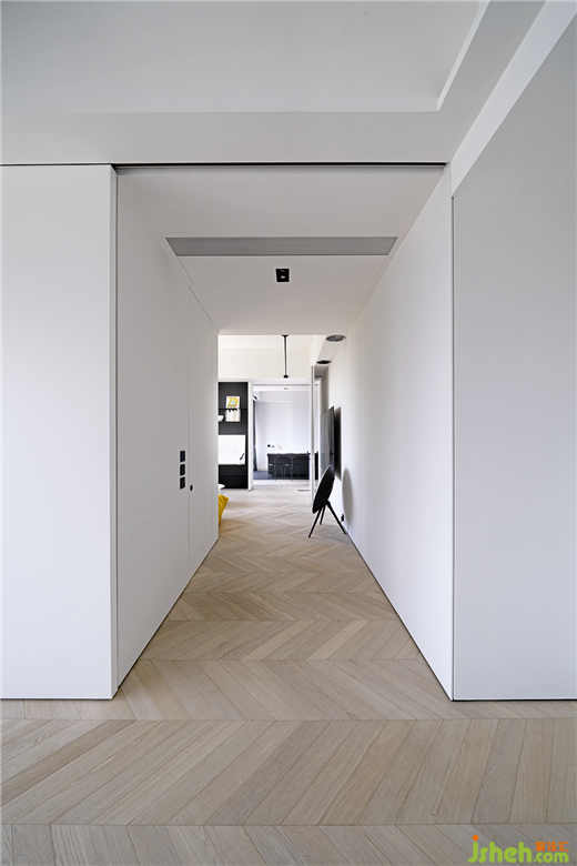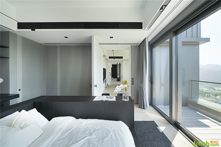 從公共區(qū)域通往兩端的私人休憩區(qū)域,情景轉(zhuǎn)換的節(jié)奏和秩序悄然發(fā)生變化。臥室前的小型私人空間,可開可合,適合一人獨(dú)自安靜閱讀或觀賞喜愛的電影,沉浸于自我向內(nèi)探求的私享時(shí)光。