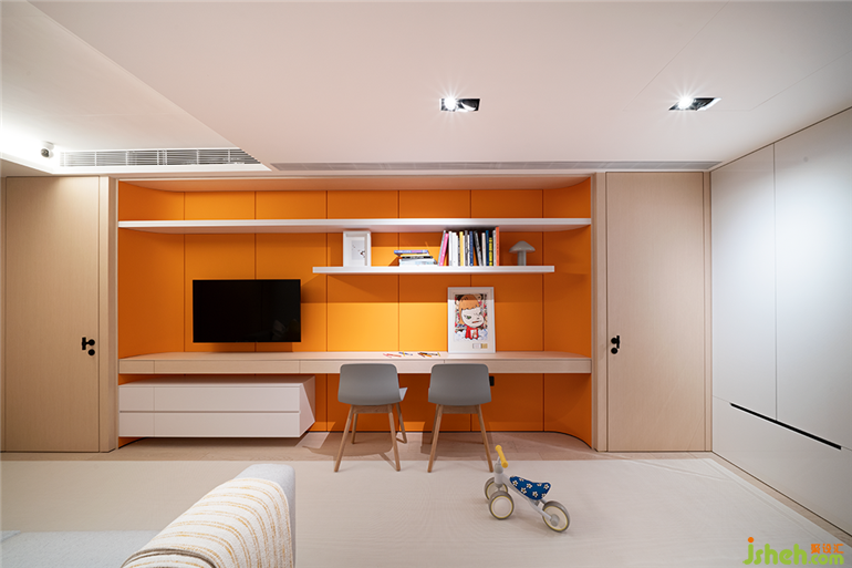 一抹活力滿滿的橙色點(diǎn)亮了二層的多功能公區(qū),這里可以是父母陪伴孩子閱讀寫作的親子空間,也可以是屬于小朋友獨(dú)自探索未知世界的私享天地。香港駿嶺薈私宅設(shè)計(jì)所有臥室與小客廳形成動(dòng)靜分區(qū),兼顧家庭成員各自的生活習(xí)慣,互不打擾,但有所照應(yīng)。