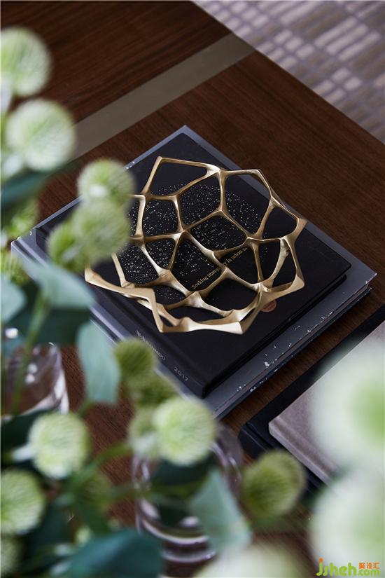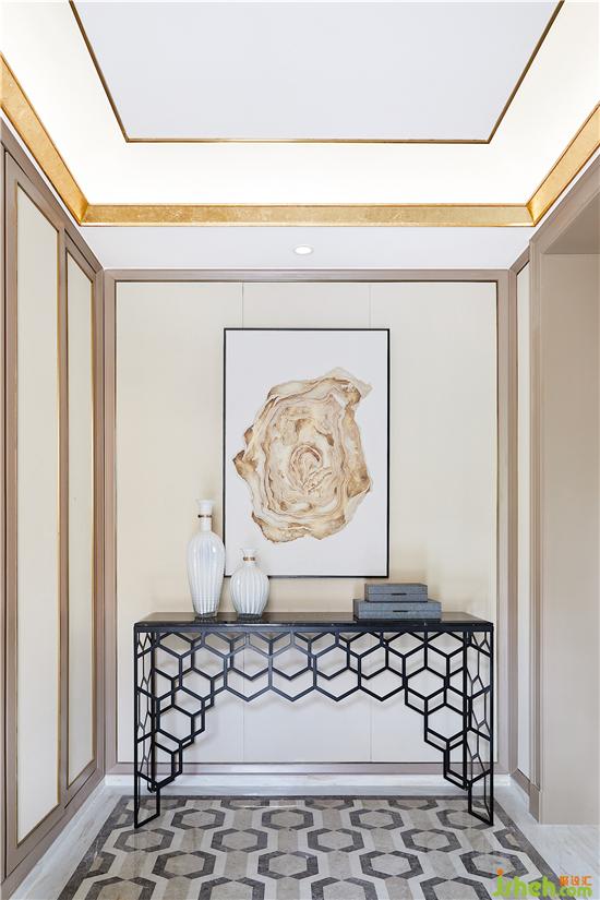 在玄關(guān),圍繞主題展開的蜂巢造型端景臺(tái),通過幾何變換延伸出輕盈別致的藝術(shù)性。裝飾畫似金色玫瑰優(yōu)雅綻放,又仿若花蜜清瑩欲滴,恰到好處點(diǎn)綴了空間的視覺中心,勾勒出彬彬有禮的迎迓場(chǎng)景。