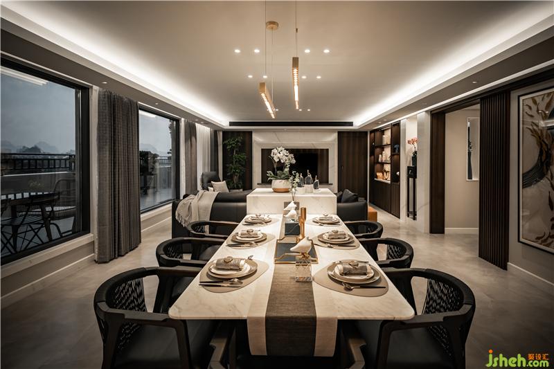 客廳與餐廳沒有任何隔墻的設(shè)計,不論是坐哪都能看到電視,去掉繁雜,保持著大空間,在軟裝色調(diào)上也保持著統(tǒng)一。