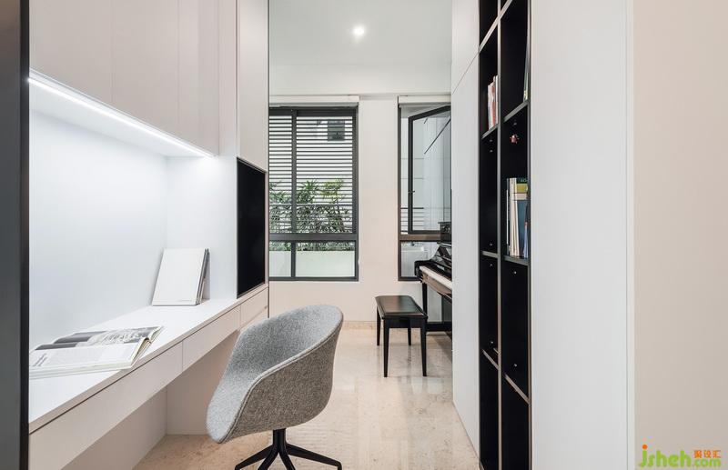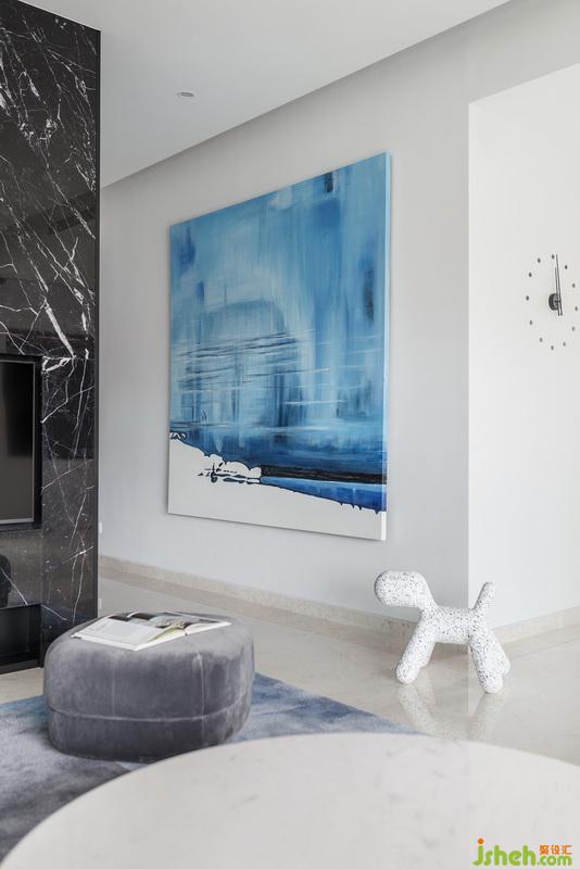 空間整體的中性淺色調(diào),亦營(yíng)造出最干凈溫和的視覺(jué)觀感,同時(shí)輔之較大面積的靛藍(lán)色塊與之搭配,設(shè)計(jì)公司用冷調(diào)降低新加坡四季炎夏的灼熱感