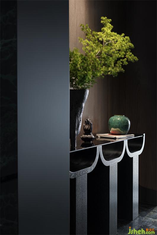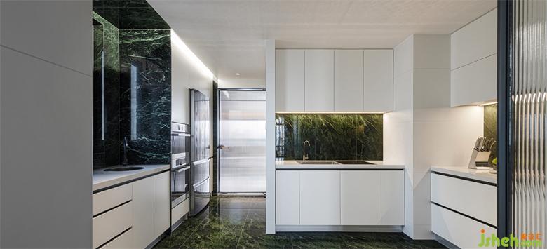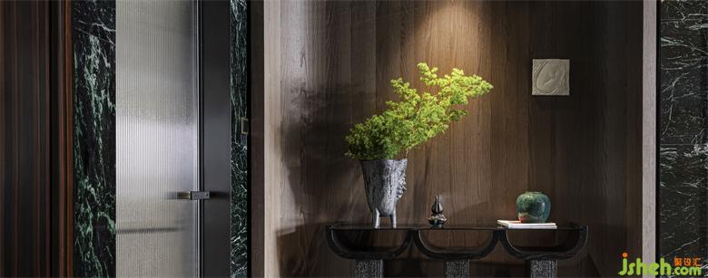 搭以溫潤(rùn)的咖色木飾面和肌理感的綠色大理石。